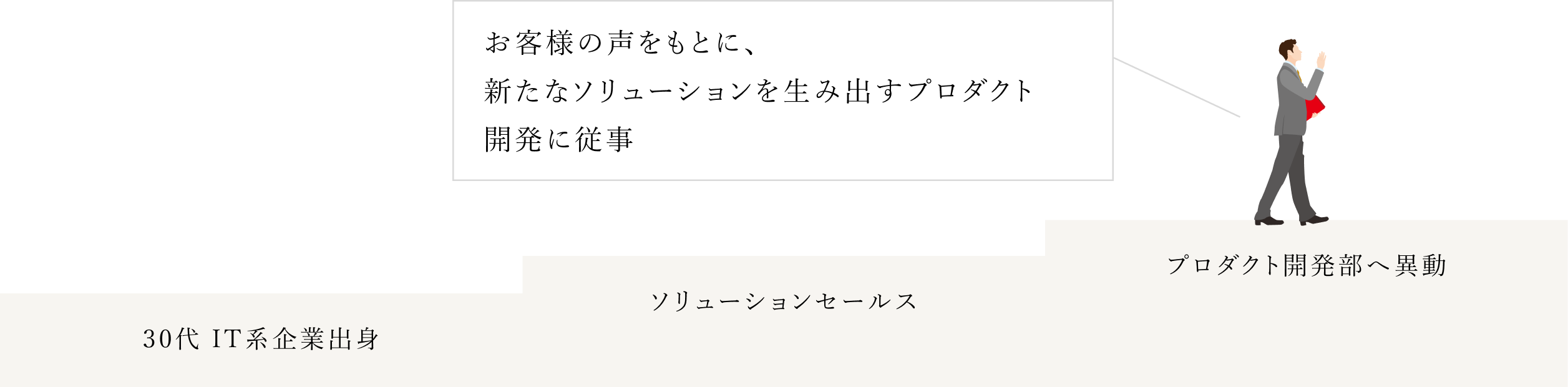 プロダクトやソリューションを柔軟に組み合わせ、採用戦略の策定から組織づくり、業務プロセスの見直しに至るまで、抜本的な解決に向けたあらゆる提案を行い、実行にも伴走。時にはプロダクト職と連携し、お客様の声を機能に反映させるなど、社内外を巻き込んで課題解決を推進します。